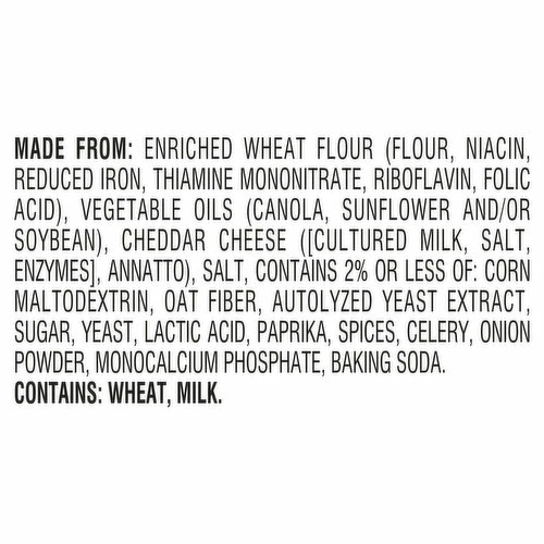 Made from: Enriched Wheat Flour (Flour, Niacin, Reduced Iron, Thiamine Mononitrate, Riboflavin, Folic Acid), Vegetable Oils (Canola, Sunflower and/or Soybean), Cheddar Cheese ([Cultured Milk, Salt, Enzymes], Annatto), Salt, Contains 2% or Less of: Corn Maltodextrin, Oat Fiber, Autolyzed Yeast Extract, Sugar, Yeast, Lactic Acid, Paprika, Spices, Celery, Onion Powder, Monocalcium Phosphate, Baking Soda.