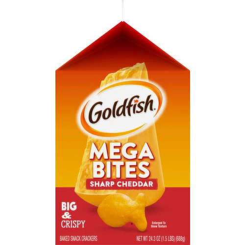 Experience the mega. Mega goldfish. Regular goldfish. Mega crispy, mega cheesy, mega delicious.