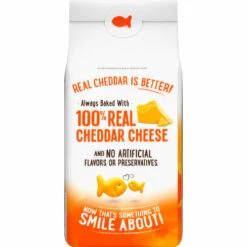 Baked with 12 g of whole grain per serving. Contains bioengineered food ingredients. The ingredients from canola and soy in this product come from genetically modified crops. Learn more at pepperidgefarm.com. Baked with whole grain cheddar. Real cheddar is better! Always baked with 100% real cheddar cheese and no artificial flavors or preservatives. Not that’s something to smile about! goldfishfun.com. how2recycle.info. pepperridgefarm.com Help your kids discover more smiles at goldfishfun.com. If you have any questions or comments about this product, please include printed date code from top of package, along with the proof of purchase panel. Questions or Comments? 1-888-737-7374. Baked in USA.