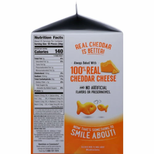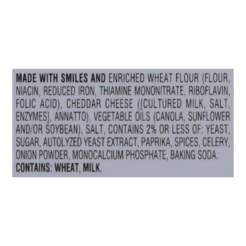 Made with Smiles and Enriched Wheat Flour (Flour, Niacin, Reduced Iron, Thiamine Mononitrate, Riboflavin, Folic Acid), Cheddar Cheese ([Cultured Milk, Salt, Enzymes], Annatto), Vegetable Oils (Canola, Sunflower and/or Soybean), Salt, Contains 2% or Less of: Yeast, Sugar, Autolyzed Yeast Extract, Paprika, Spices, Celery, Onion Powder, Monocalcium Phosphate, Baking Soda.