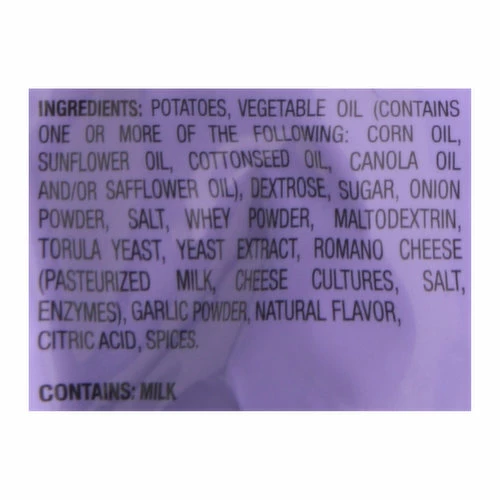 Potatoes, Vegetable Oil (Contains One or More of the Following: Corn Oil, Sunflower Oil, Cottonseed Oil, Canola Oil and/or Safflower Oil), Dextrose, Sugar, Onion Powder, Salt, Whey Powder, Maltodextrin, Torula Yeast, Yeast Extract, Romano Cheese (Pasteurized Milk, Cheese Cultures, Salt, Enzymes), Garlic Powder, Natural Flavor, Citric Acid, Spices.