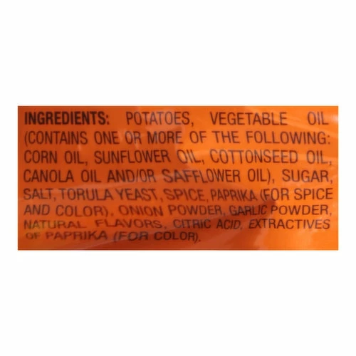 Potatoes, Vegetable Oil Contains One or More of the Following: Corn Oil, Sunflower Oil, Cottonseed Oil, Canola Oil and/or Safflower Oil), Sugar, Salt, Torula Yeast, Spice, Paprika (for Spice and Color), Onion Powder, Garlic Powder, Natural Flavors, Citric Acid, Extractives of Paprika (for Color).