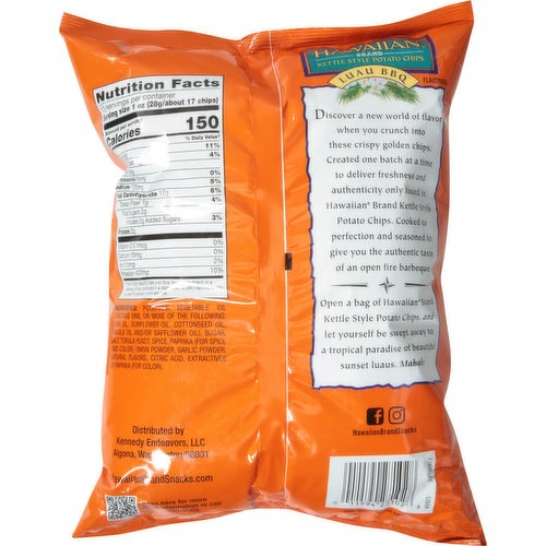Sweet & spicy! Crispy & crunchy. Discover a new world of flavor when you crunch into these crispy golden chips. Created one batch at a time to deliver freshness and authenticity only found in Hawaiian Brand Kettle Style Potato Chips. Cooked to perfection and seasoned to give you the authentic taste of an open fire barbeque. Open a bag of Hawaiian Brand Kettle Style Potato Chips, and let yourself be swept away to a tropical paradise of beautiful sunset luaus. Mahalo.
