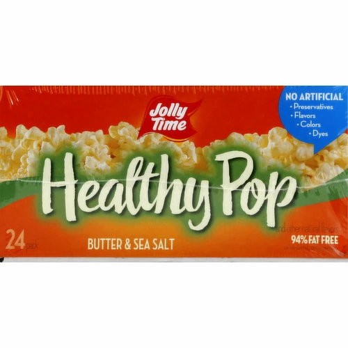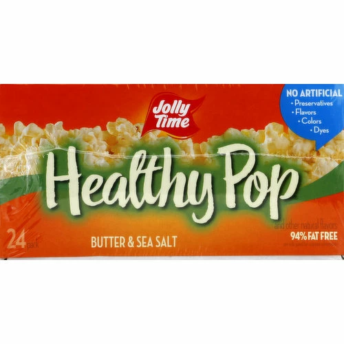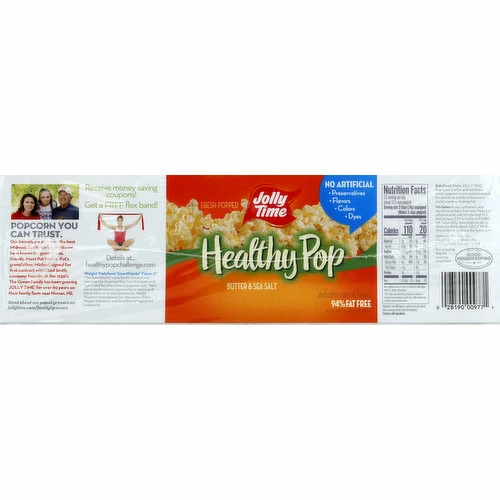 Butter & sea salt and other natural flavors. 20 calories per cup. 100% whole grain. Gluten free. 94% fat free. See side panel for nutrition information. Non GMO kernels. No artificial: preservatives: flavors; colors; dyes. Fresh popped. Popcorn you can trust. Our kernels are grown on the best midwest family farms by folks we have known for generations, literally. Meet Pat Green. Pat’s grandfather, Michael signed the first contract with Cloid Smith, company founder, in the 1930’s. The green family has been growing Jolly Time for over 80 years on their family farm near homer, NE. Good Housekeeping: Since 1909. Quality Tested. Limited warranty. ghseal.com for details. Read about our proud growers at: jollytime.com/family/growers. We listen to our customers, and we’d love to hear from you. Pop in at jollytime.com; call 712-239-1232 M-F. 8am to 5 pm CST or write to PO Box 178, Sioux City, Lowa 51102 to tell us what you think about jolly time. We’re listening. Share the family fun! Receive money saving coupons! Get a free flex band! Details at healthypopchallenge.com. Weight Watchers SmartPoints Value: 3 (The SmartPoints value for this product was calculated by American Pop Corn Company and is provided for informational purposes only. This is not an endorsement, sponsorship or approval of this product or its manufacturer by Weight Watchers International, Inc. the owner of the Weight Watchers and SmartPoints registered trademarks. Printed in USA.