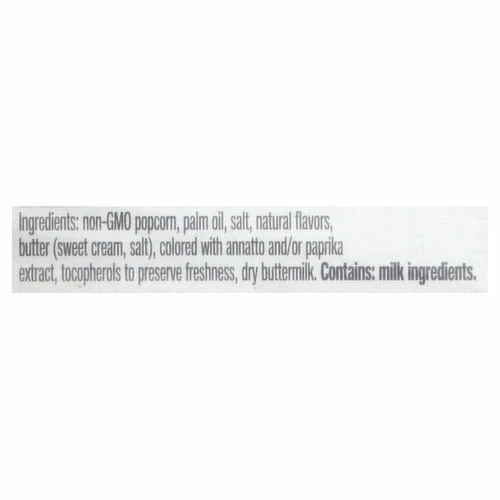 Non-GMO Popcorn, Palm Oil, Salt, Natural Flavors, Butter (Sweet Cream, Salt), Colored with Annatto and/or Paprika Extract, Tocopherols to Preserve Freshness, Dry Buttermilk.