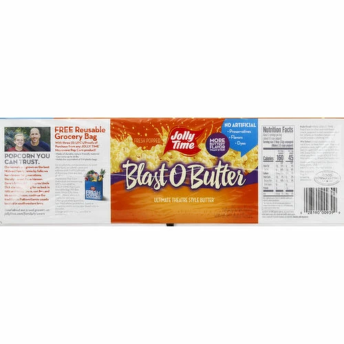 No artificial flavors. Natural butter flavor with other natural flavors. 45 calories per cup. Gluten Free. No Artificial: Preservatives; Dyes. 100% Whole grain. Non GMO kernels. Fresh popped. More buttery flavor than ever! Popcorn You Can Trust: Our kernels are grown on the best Midwest family farms by folks we have known for generations, literally, meet Dave Hansen, Dave’s father Brian, and his Uncle Dick started growing for us back in 1982 and today, Dave, son Ben and his cousin, Mason, continue the tradition in Pottawattamie county located in southwestern Iowa. Read about our proud growers at: jollytime.com/family/growers. Good Housekeeping: Since 1909. Quality tested. Limited warranty. ghseal.com for details. ghseal.com. jollytime.com/family/growers. jollytime.com/promotions. We listen to our customers, and we’d love to hear from you. Pop in at jollytime.com; call 712-239-1232 M-F 8am to 5pm CST or write to PO Box 178, Sioux City, Iowa 51102 to tell us what you think about Jolly Time. We’re listening. Share the family fun! Free Reusable Grocery Bag: With three (3) UPC’s/Proofs of Purchase from any Jolly Time Microwave Pop Corn product! Made of durable, nature friendly material. Can carry up to 22 lbs. Holds the equivalent of 3-4 plastic bags. Go to jollytime.com/promotions to print offer form, or submit name and address with 3 UPC’s/Proofs of Purchase from any box of Jolly Time. Microwave Pop Corn (individual microwave bag UPC’s not valid) to: Jolly Time Pop Corn, Reusable Bag, PO Box 6001, Sioux City, Iowa 51102. Please allow 6-8 weeks for delivery offer good while quantities last. Void where prohibited, taxed or otherwise restricted by law. Good only in the USA. (Design and color may vary due to availability). Fresh Popped goodness. Printed in USA.