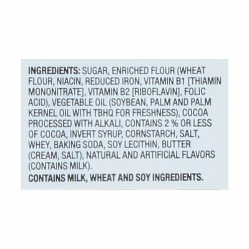 Sugar, Enriched Flour (Wheat Flour, Niacin, Reduced Iron, Vitamin B1 [Thiamin Mononitrate], Vitamin B2 [Riboflavin], Folic Acid), Vegetable Oil (Soybean, Palm and Palm Kernel Oil with TBHQ for Freshness), Cocoa Processed with Alkali, Contains 2% or Less of Cocoa, Invert Syrup, Cornstarch, Salt, Whey, Baking Soda, Soy Lecithin, Butter (Cream, Salt), Natural and Artificial Flavors (Contains Milk).