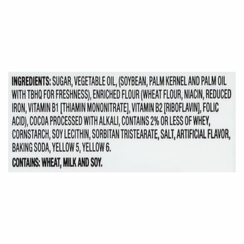 Sugar, Vegetable Oil, (Soybean, Palm Kernel and Palm Oil with TBHQ for Freshness), Enriched Flour (Wheat Flour, Niacin, Reduced Iron, Vitamin B1 [Thiamin Mononitrate], Vitamin B2 (Riboflavin], Folic Acid), Cocoa Processed with Alkali, Contains 2% or Less of Whey, Cornstarch, Soy Lecithin, Sorbitan Tristearate, Salt, Artificial Flavor, Baking Soda, Yellow 5, Yellow 6.