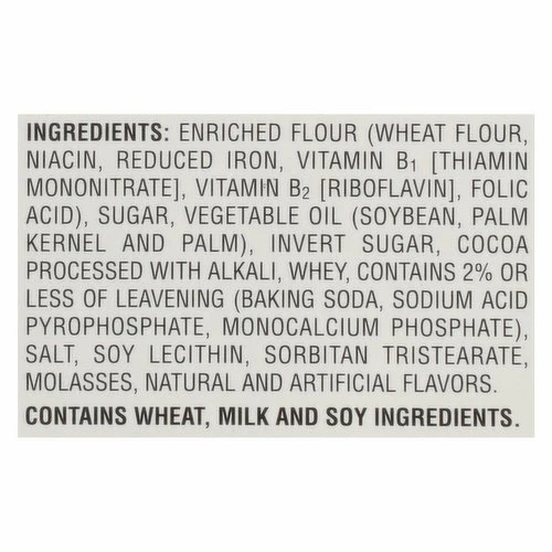 Enriched Flour (Wheat Flour, Niacin, Reduced Iron, Vitamin B1 [Thiamin Mononitrate], Vitamin B2 [Riboflavin], Folic Acid), Sugar, Vegetable Oil (Soybean, Palm Kernel and Palm), Invert Sugar, Cocoa Processed with Alkali, Whey, Contains 2% or Less of Leavening (Baking Soda, Sodium Acid Pyrophosphate, Monocalcium Phosphate), Salt, Soy Lecithin, Sorbitan Tristearate, Molasses, Natural and Artificial Flavors.