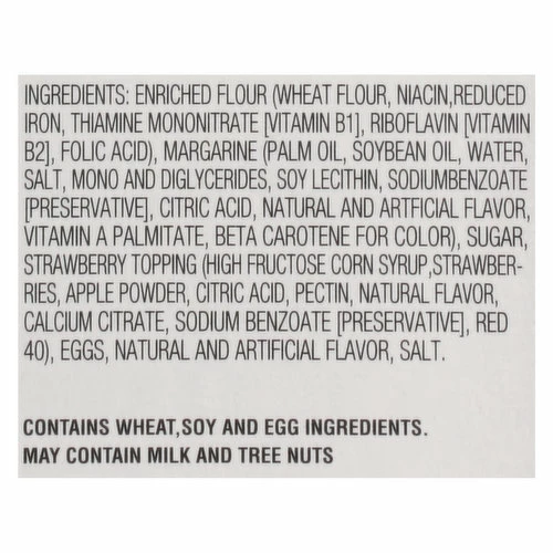 Enriched Flour (Wheat Flour, Niacin, Reduced Iron, Thiamine Mononitrate [Vitamin B1], Riboflavin [Vitamin B2], Folic Acid), Margarine (Palm Oil, Soybean Oil, Water, Salt, Mono and Diglycerides, Soy Lecithin, Sodiumbenzoate [Preservative], Citric Acid, Natural and Artificial Flavor, Vitamin A Palmitate, Beta Carotene for Color), Sugar, Strawberry Topping (High Fructose Corn Syrup, Strawberries, Apple Powder, Citric Acid, Pectin, Natural Flavor, Calcium Citrate, Sodium Benzoate [Preservative], Red 40), Eggs, Natural and Artificial Flavor, Salt.