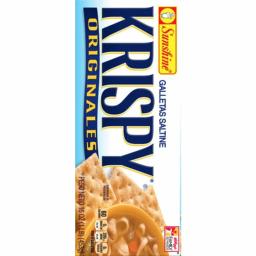 Crispy, crunchy, and a little bit toasty, Sunshine Krispy Original Saltine Crackers are made with our tried and true recipe of enriched flour, baking soda, yeast, and a generous sprinkle of salt. With a distinctively dry and crisp texture, our Krispy Original Saltine Crackers are ideal for snacking and go great with soups and salads, savory spreads, dips, meats, and cheeses. A classic snack cracker in an instantly recognizable square shape, there’s a crispy crunch with every bite.
