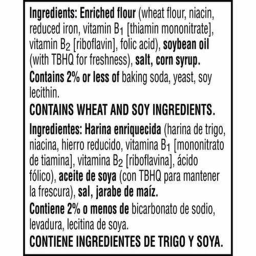 Enriched Flour (Wheat Flour, Niacin, Reduced Iron, Vitamin B1 [Thiamin Mononitrate], Vitamin B2 [Riboflavin], Folic Acid), Soybean Oil (With Tbhq For Freshness), Salt, Corn Syrup. Contains 2% Or Less Of Baking Soda, Yeast, Soy Lecithin.