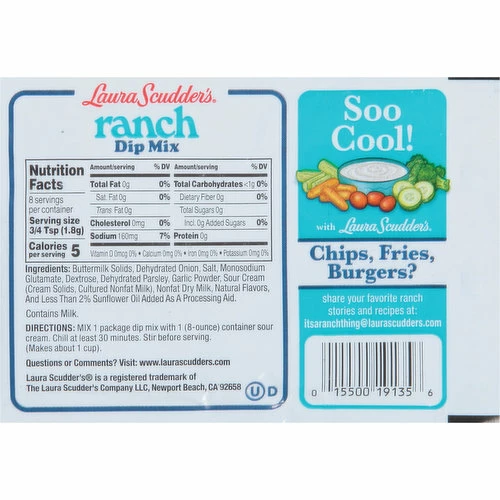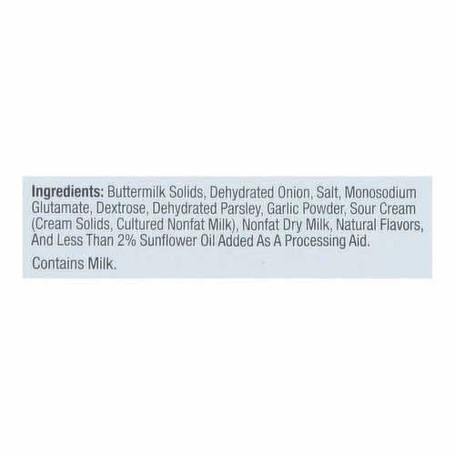 Buttermilk Solids, Dehydrated Onion, Salt, Monosodium Glutamate, Dextrose, Dehydrated Parsley, Garlic Powder, Sour Cream (Cream Solids, Cultured Nonfat Milk), Nonfat Dry Milk, Natural Flavors, and Less than 2% Sunflower Oil Added as a Processing Aid.