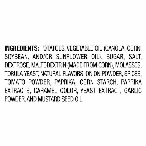 Potatoes, Vegetable Oil (Canola, Corn, Soybean, and/or Sunflower Oil), Sugar, Salt, Dextrose, Maltodextrin (Made from Corn), Molasses, Torula Yeast, Natural Flavors, Onion Powder, Spices, Tomato Powder, Paprika, Corn Starch, Paprika Extracts, Caramel Color, Yeast Extract, Garlic Powder, and Mustard Seed Oil.