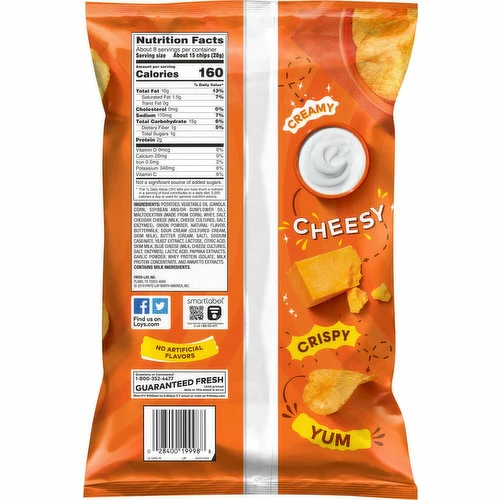 Potatoes, Vegetable Oil (Canola, Corn, Soybean and/or Sunflower Oil), Maltodextrin (Made from Corn), Whey, Salt, Cheddar Cheese (Milk, Cheese Cultures, Salt, Enzymes), Onion Powder, Natural Flavor, Buttermilk, Sour Cream (Cultured Cream, Skim Milk), Butter (Cream, Salt), Sodium Caseinate, Yeast Extract, Lactose, Citric Acid, Skim Milk, Blue Cheese (Milk, Cheese Cultures, Salt, Enzymes), Lactic Acid, Paprika Extracts, Garlic Powder, Whey Protein Isolate, Milk Protein Concentrate, and Annatto Extracts.
