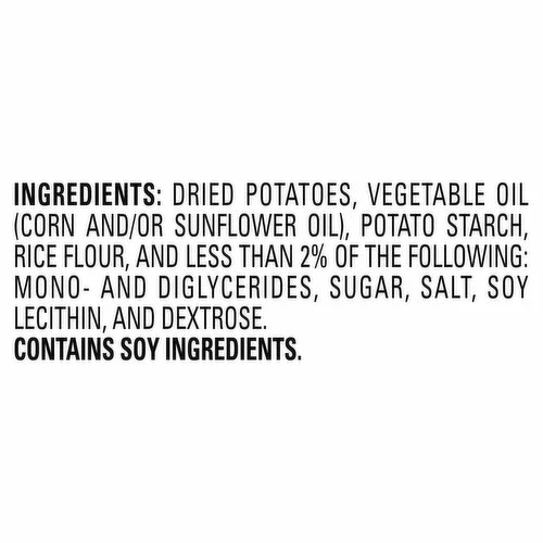 Dried Potatoes, Vegetable Oil (Corn and/or Sunflower Oil), Potato Starch, Rice Flour, and Less than 2% of the Following: Mono- and Diglycerides, Sugar, Salt, Soy Lecithin, and Dextrose.
