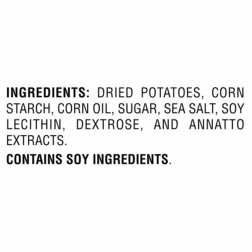 Dried Potatoes, Corn Starch, Corn Oil, Sugar, Sea Salt, Soy Lecithin, Dextrose, and Annatto Extracts.