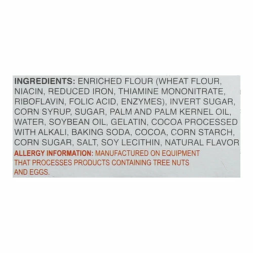 Enriched Flour (Wheat Flour, Niacin, Reduced Iron, Thiamine Mononitrate, Riboflavin, Folic Acid, Enzymes), Invert Sugar, Corn Syrup, Sugar, Palm and Palm Kernel Oil, Water, Soybean Oil, Gelatin, Cocoa Processed with Alkali, Baking Soda, Cocoa, Corn Starch, Corn Sugar, Salt, Soy Lecithin, Natural Flavor.