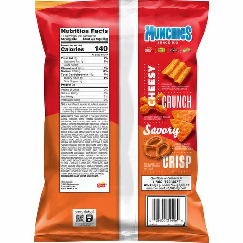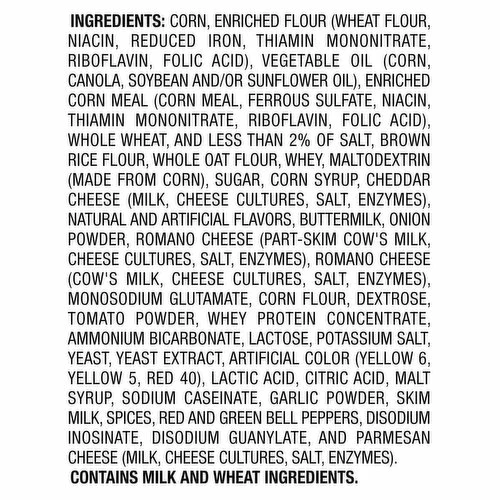 Corn, Enriched Flour Wheat Flour, Niacin, Reduced Iron, Thiamin Mononitrate, Riboflavin, Folic Acid), Vegetable Oil (Corn, Canola, Soybean and/or Sunflower Oil), Enriched Corn Meal (Corn Meal, Ferrous Sulfate, Niacin, Thiamin Mononitrate, Riboflavin, Folic Acid), Whole Wheat, and Less than 2% of Salt, Brown Rice Flour, Whole Oat Flour, Whey, Maltodextrin (Made from Corn), Sugar, Corn Syrup, Cheddar Cheese (Milk, Cheese Cultures, Salt, Enzymes), Natural and Artificial Flavors, Buttermilk, Onion Powder, Romano Cheese (Part-Skim Cow’s Milk, Cheese Cultures, Salt, Enzymes), Romano Cheese (Cow’s Milk, Cheese Cultures, Salt, Enzymes), Monosodium Glutamate, Corn Flour, Dextrose, Tomato Powder, Whey Protein Concentrate, Ammonium Bicarbonate, Lactose, Potassium Salt, Yeast, Yeast Extract, Artificial Color (Yellow 6, Yellow 5, Red 40), Lactic Acid, Citric Acid, Malt Syrup, Sodium Caseinate, Garlic Powder, Skim Milk, Spices, Red and Green Bell Peppers, Disodium Inosinate, Disodium Guanylate, and Parmesan Cheese (Milk, Cheese Cultures, Salt, Enzymes).