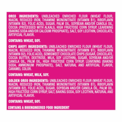 Golden Oreo: Unbleached Enriched Flour (Wheat Flour, Niacin, Reduced Iron, Thiamine Mononitrate {Vitamin B1}, Riboflavin {Vitamin B2}, Folic Acid), Sugar, Soybean and/or Canola Oil, Palm Oil, High Fructose Corn Syrup, Salt, Baking Soda, Soy Lecithin, Natural and Artificial Flavor. Chips Ahoy!: Unbleached Enriched Flour (Wheat Flour, Niacin, Reduced Iron, Thiamine Mononitrate {Vitamin B1}, Riboflavin {Vitamin B2}, Folic Acid), Semisweet Chocolate Chips (Sugar, Chocolate, Cocoa Butter, Dextrose, Milk, Soy Lecithin) Sugar, Soybean and/or Canola Oil, Palm Oil, High Fructose Corn Syrup, Leavening (Baking Soda, Ammonium Phosphate), Salt, Natural and Artificial Flavor, Caramel Flavor. Oreo: Unbleached Enriched Flour (Wheat Flour, Niacin, Reduced Iron, Thiamine Mononitrate {Vitamin B1}, Riboflavin {Vitamin B2}, Folic Acid), Sugar, Palm Oil, Soybean and/or Canola Oil, Cocoa (Processed with Alkali), High Fructose Corn Syrup, Leavening (Baking Soda and/or Calcium Phosphate), Salt, Soy Lecithin, Chocolate, Artificial Flavor.