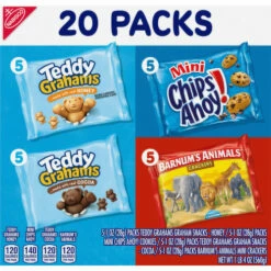 This Fun Shapes Variety Pack includes Barnum’s Animal Crackers, CHIPS AHOY! Mini and Teddy Grahams in both honey and chocolate for easy, grab-and-go nibbling. These snack packs have all the classic snack flavors, perfect for a simple treat or afternoon munchies. Barnum’s Animal Crackers provide satisfying sweetness, and CHIPS AHOY! mini chocolate chip cookies deliver the same great flavor in a bite-size snack. Two flavors of Teddy Grahams give you the classic taste of honey graham crackers and chocolate graham crackers for delicious sweet snacks. Make your lunch special with these yummy lunch snacks, or reach for one whenever you want to satisfy your sweet tooth. This box includes 20 individually packaged cookie snack packs on the go for easy storage and convenient transport.