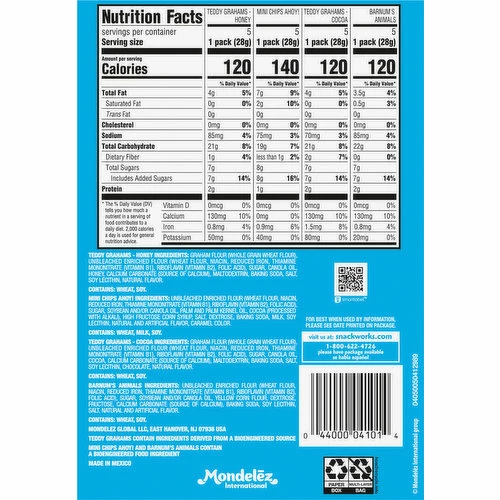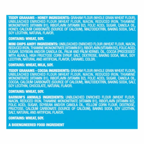 Teddy Grahams – Cocoa: Graham Flour (Whole Grain Wheat Flour), Unbleached Enriched Flour (Wheat Flour, Niacin, Reduced Iron, Thiamine Mononitrate {Vitamin B1}, Riboflavin (Vitamin B2}, Folic Acid), Sugar, Canola Oil, Cocoa, Calcium Carbonate (Source of Calcium), Maltodextrin, Baking Soda, Salt, Soy Lecithin, Chocolate, Natural Flavor. Mini Chips Ahoy!: Unbleached Enriched Flour (Wheat Flour, Niacin, Reduced Iron, Thiamine Mononitrate (Vitamin B1}, Riboflavin {Vitamin B2}, Folic Acid), Sugar, Soybean and/or Canola Oil, Palm and Palm Kernel Oil, Cocoa (Processed with Alkali), High Fructose Corn Syrup, Salt, Dextrose, Baking Soda, Milk, Soy Lecithin, Natural and Artificial Flavor, Caramel Color. Teddy Grahams – Honey: Graham Flour (Whole Grain Wheat Flour), Unbleached Enriched Flour (Wheat Flour, Niacin, Reduced Iron, Thiamine Mononitrate {Vitamin B1}, Riboflavin (Vitamin B2}, Folic Acid), Sugar, Canola Oil, Honey, Calcium Carbonate (Source of Calcium), Maltodextrin, Baking Soda, Salt, Soy Lecithin, Natural Flavor. Barnum’s Animals: Unbleached Enriched Flour (Wheat Flour, Niacin, Reduced Iron, Thiamine Mononitrate (Vitamin B1), Riboflavin (Vitamin B2}, Folic Acid), Sugar, Soybean and/or Canola Oil, Yellow Corn Flour, Dextrosé, Fructose, Calcium Carbonate (Source of Calcium), Baking Soda, Soy Lecithin, Salt, Natural and Artificial Flavor.