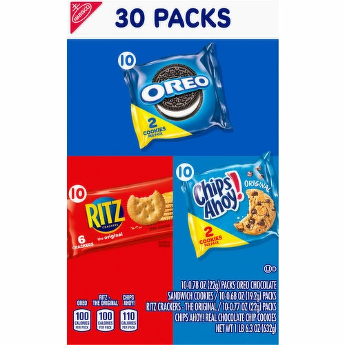 This Nabisco Snacks Variety Pack includes OREO cookies, CHIPS AHOY! cookies, RITZ crackers for all the classic flavors you know in convenient snack-size packages. This snack variety pack offers individually portioned versions of these tasty treats, perfect for filling lunchboxes or on-the-go nibbling. OREO cookies have original OREO crème filling sandwiched between two chocolate sandwich cookies, CHIPS AHOY! cookies are crispy and packed with yummy chocolate chips for a tasty snack. RITZ original crackers provide a savory salty crunch. This cookie and cracker variety pack includes thirty individual snack packs, 10 packs of OREO cookies, 10 packs of CHIPS AHOY! cookies (2 cookies per pack) and 10 packs of RITZ crackers (6 crackers per pack). Include these lunch snacks in your lunchbox for a special treat, or keep this snack variety pack for adults at your desk to curb afternoon hunger.