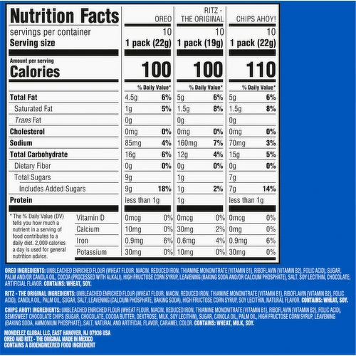 Ritz – The Original Ingredients: Unbleached Enriched Flour (Wheat Flour, Niacin, Reduced Iron, Thiamine Mononitrate {Vitamin B1}, Riboflavin {Vitamin B2}, Folic Acid), soybean and/or canola oil, palm oil, sugar, salt, Leavening (Calcium Phosphate, Baking Soda), High Fructose Corn Syrup, Soy Lecithin, Natural Flavor. Chips Ahoy! Ingredients: Unbleached Enriched Flour (Wheat Flour, Niacin, Reduced Iron, Thiamine Mononitrate {Vitamin B1}, Riboflavin {Vitamin B2}, Folic Acid), Semisweet Chocolate Chips (Sugar, Chocolate, Cocoa Butter, Dextrose, Milk, Soy Lecithin), Sugar, soybean and/or Canola Oil, Palm Oil, High Fructose Corn Syrup, Leavening (Baking Soda, Ammonium Phosphate), Salt, Natural and Artificial Flavor, Caramel Color. Oreo Ingredients: Unbleached Enriched Flour (Wheat Flour, Niacin, Reduced Iron, Thiamine Mononitrate {Vitamin B1}, Riboflavin {Vitamin B2}, Folic Acid), Sugar, Palm oil, soybean and/or Canola Oil, Cocoa (Processed with Alkali), High Fructose Corn Syrup, Leavening (Baking Soda and/or Calcium Phosphate), Salt, Soy Lecithin, Chocolate, Artificial Flavor.