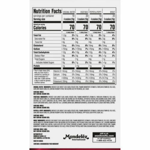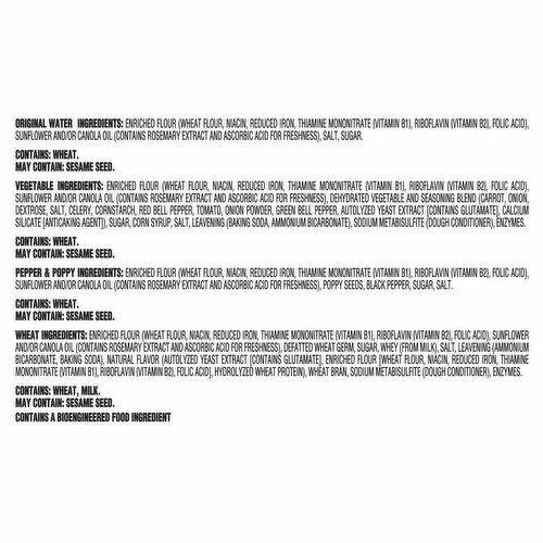 Original Water: Enriched Flour (Wheat Flour, Niacin, Reduced Iron, Thiamine Mononitrate (Vitamin B1), Riboflavin (Vitamin B2), Folic Acid), Sunflower and/or Canola Oil (Contains Rosemary Extract and Ascorbic Acid for Freshness), Salt, Sugar. Vegetable: Enriched Flour (Wheat Flour, Niacin, Reduced Iron, Thiamine Mononitrate (Vitamin B1), Riboflavin (Vitamin B2), Folic Acid), Sunflower and/or Canola Oil (Contains Rosemary Extract and Ascorbic Acid for Freshness), Dehydrated Vegetable and Seasoning Blend (Carrot, Onion, Dextrose, Salt, Celery, Cornstarch, Red Bell Pepper, Tomato, Onion Powder, Green Bell Pepper, Autolyzed Yeast Extract [Contains Glutamate], Calcium Silicate [Anticaking Agent]), Sugar, Corn Syrup, Salt, Leavening (Baking Soda, Ammonium Bicarbonate), Sodium Metabisulfite (Dough Conditioner), Enzymes. Pepper & Poppy: Enriched Flour (Wheat Flour, Niacin, Reduced Iron, Thiamine Mononitrate (Vitamin B1), Riboflavin (Vitamin B2), Folic Acid), Sunflower and/or Canola Oil (Contains Rosemary Extract and Ascorbic Acid for Freshness), Poppy Seeds, Black Pepper, Sugar, Salt. Wheat: Enriched Flour (Wheat Flour, Niacin, Reduced Iron, Thiamine Mononitrate (Vitamin B1), Riboflavin (Vitamin B2), Folic Acid), Sunflower and/or Canola Oil (Contains Rosemary Extract and Ascorbic Acid for Freshness), Defatted Wheat Germ, Sugar, Whey (from Milk), Salt, Leavening (Ammonium Bicarbonate, Baking Soda), Natural Flavor (Autolyzed Yeast Extract [Contains Glutamate], Enriched Flour [Wheat Flour, Niacin, Reduced Iron, Thiamine Mononitrate (Vitamin B1), Riboflavin (Vitamin B2), Folic Acid), Hydrolyzed Wheat Protein), Wheat Bran, Sodium Metabisulfite (Dough Conditioner), Enzymes.