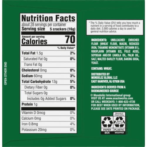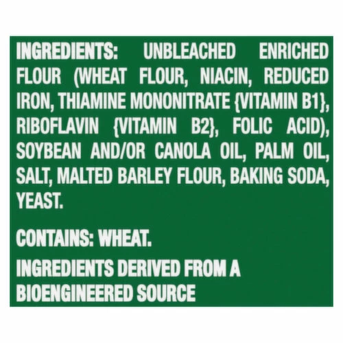 Unbleached Enriched Flour (Wheat Flour, Niacin, Reduced Iron, Thiamine Mononitrate {Vitamin B1}, Riboflavin {Vitamin B2}, Folic Acid), Soybean and/or Canola Oil, Palm Oil, Salt, Malted Barley Flour, Baking Soda, Yeast.