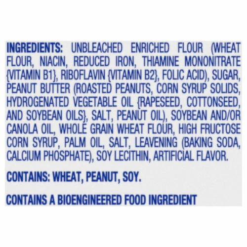 Unbleached Enriched Flour (Wheat Flour, Niacin, Reduced Iron, Thiamine Mononitrate {Vitamin B1}, Riboflavin {Vitamin B2}, Folic Acid), Sugar, Peanut Butter (Roasted Peanuts, Corn Syrup Solids, Hydrogenated Vegetable Oil {Rapeseed, Cottonseed, and Soybean Oils}, Salt, Peanut Oil), Canola Oil, Whole Grain Wheat Flour, High Fructose Corn Syrup, Palm Oil, Salt, Leavening (Baking Soda, Calcium Phosphate), Soy Lecithin, Artificial Flavor.