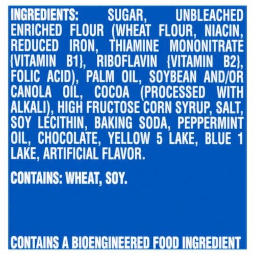Sugar, Unbleached Enriched Flour (Wheat Flour, Niacin, Reduced Iron, Thiamine Mononitrate {Vitamin B1}, Riboflavin {Vitamin B2}, Folic Acid), Palm Oil, Soybean and/or Canola Oil, Cocoa (Processed with Alkali), High Fructose Corn Syrup, Salt, Soy Lecithin, Baking Soda, Peppermint Oil, Chocolate, Yellow 5 Lake, Blue 1 Lake, Artificial Flavor.