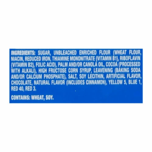 Sugar, Unbleached Enriched Flour (Wheat Flour, Niacin, Reduced Iron, Thiamine Mononitrate {Vitamin B1}, Riboflavin (Vitamin B2}, Folic Acid), Palm and/or Canola Oil, Cocoa (Processed with Alkali), High Fructose Corn Syrup, Leavening (Baking Soda and/or Calcium Phosphate), Salt, Soy Lecithin, Artificial Flavor, Chocolate, Natural Flavor (Includes Cinnamon), Yellow 5, Blue 1, Red 40, Red 3.
