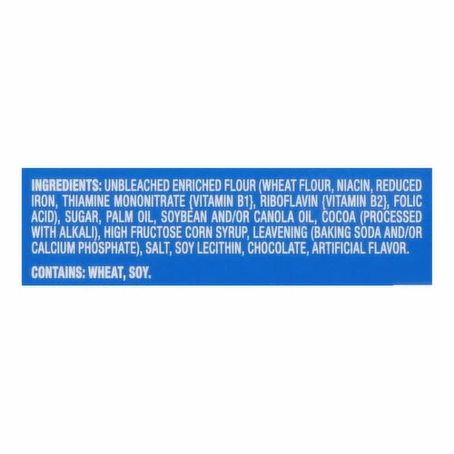 Unbleached Enriched Flour (Wheat Flour, Niacin, Reduced Iron, Thiamine Mononitrate {Vitamin B1}, Riboflavin {Vitamin B2}, Folic Acid), Sugar, Palm Oil, Soybean and/or Canola Oil, Cocoa (Processed with Alkali), High Fructose Corn Syrup, Leavening (Baking Soda and/or Calcium Phosphate), Salt, Soy Lecithin, Chocolate, Artificial Flavor.