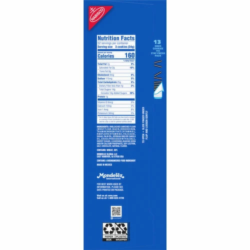 Nabisco. 12 stay fresh packs. No high fructose corn syrup. 13 Oreo cookies per stay fresh packs. Cocoa Life: 100% sustainably sourced cocoa. At Oreo, we’re all about the good stuff. Through our partnership with Cocoa Life, we help support sustainable cocoa sourcing. For more information, visit cocoalife.org.