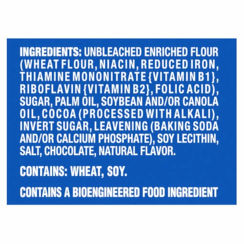 Unbleached Enriched Flour (Wheat Flour, Niacin, Reduced Iron, Thiamine Mononitrate {Vitamin B1}, Riboflavin {Vitamin B2}, Folic Acid), Sugar, Palm Oil, Soybean and/or Canola Oil, Cocoa (Processed with Alkali), Invert Sugar, Leavening (Baking Soda and/or Calcium Phosphate), Soy Lecithin, Salt, Chocolate, Natural Flavor.