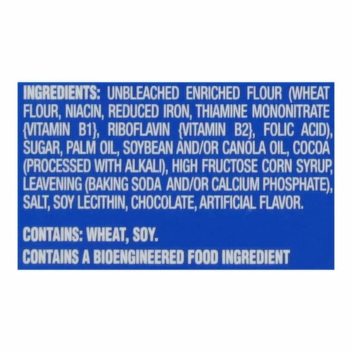 Unbleached Enriched Flour (Wheat Flour, Niacin, Reduced Iron, Thiamine Mononitrate {Vitamin B1}, Riboflavin {Vitamin B2}, Folic Acid), Sugar, Palm Oil, Soybean and/or Canola Oil, Cocoa (Processed with Alkali), High Fructose Corn Syrup, Leavening (Baking Soda and/or Calcium Phosphate), Salt, Soy Lecithin, Chocolate, Artificial Flavor.