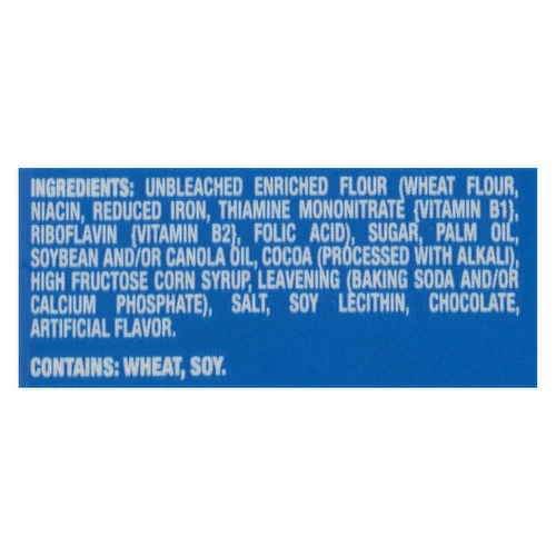 Unbleached Enriched Flour (Wheat Flour, Niacin, Reduced Iron, Thiamine Mononitrate (Vitamin B1), Riboflavin (Vitamin B2), Folic Acid), Sugar, Palm Oil, Soybean and/or Canola Oil, Cocoa (Processed with Alkali), High Fructose Corn Syrup, Leavening (Baking Soda and/or Calcium Phosphate), Salt, Soy Lecithin, Chocolate, Artificial Flavor.