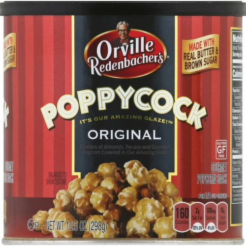 Clusters of almonds, pecans and gourmet popcorn covered in our amazing glaze. It’s our amazing glaze! Made with real butter & brown sugar. GF: gluten free. Per 1/2 Cup Serving: 160 calories; 2 g sat fat (10% DV); 110 mg sodium (4% DV); 16 g total sugars. SmartLabel: scan for more food information. Orville Redenbacher’s Poppycock is a gourmet, sweet popcorn & nut mix that’s as delicious as it is fun to eat. Made from natural ingredients, like fluffy popcorn and crunchy cashews coated in our amazing glaze made with real butter, it’s a tasty treat you can feel good about. So, grab a handful and enjoy! Questions or comments, visit us at www.orville.com or call Mon.-Fri., 1-800-243-0303 (except national holidays). Please have entire package available when you call so we may gather information off the label. This package is sold by weight, not volume. Some settling of contents may have occurred during shipping and handling. Gluten free. A product of the USA.