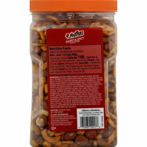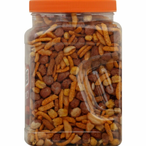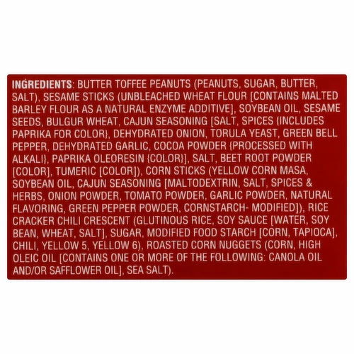 Butter Toffee Peanuts (Peanuts, Sugar, Butter, Salt), Sesame Sticks (Unbleached Wheat Flour [Contains Malted Barley Flour as a Natural Enzyme Additive], Soybean Oil, Sesame Seeds, Bulgur Wheat, Cajun Seasoning Salt [Salt, Spices {Includes Paprika for Color}, Dehydrated Onion, Torula Yeast, Green Bell Pepper, Dehydrated Garlic, Cocoa Powder {Processed with Alkali}, Paprika Oleoresin {Color}], Salt, Beet Root Powder [Color], Turmeric [Color]), Corn Sticks (Yellow Corn Masa, Soybean Oil, Cajun Seasoning [Maltodextrin, Salt, Spices, & Herbs, Onion Powder, Tomato Powder, Garlic Powder, Natural Flavoring, Green Pepper Powder, Cornstarch- Modified]), Rice Cracker Chili Crescent (Glutinous Rice, Soy Sacue [Water, Soybean, Wheat, Salt], Sugar, Modified Food Starch (Corn, High Oleic Oil [Contains One or More of the Following: Canola Oil and/or Safflower Oil], Sea Salt).