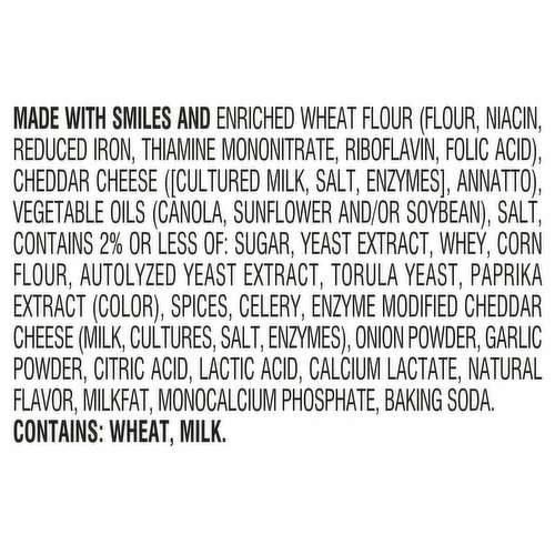 Made with Smiles and Enriched Wheat Flour (Flour, Niacin, Reduced Iron, Thiamine Mononitrate, Riboflavin, Folic Acid), Cheddar Cheese ([Cultured Milk, Salt, Enzymes], Annatto), Vegetable Oils (Canola, Sunflower and/or Soybean), Salt, Contains 2% or Less of: Sugar, Yeast Extract, Whey, Corn Flour, Autolyzed Yeast Extract, Torula Yeast, Paprika Extract (Color), Spices, Celery, Enzyme Modified Cheddar Cheese (Milk, Cultures, Salt, Enzymes), Onion Powder, Garlic Powder, Citric Acid, Lactic Acid, Calcium Lactate, Natural Flavor, Milkfat, Monocalcium Phosphate, Baking Soda.