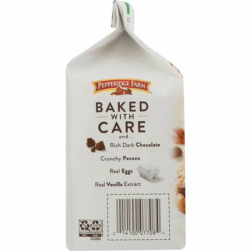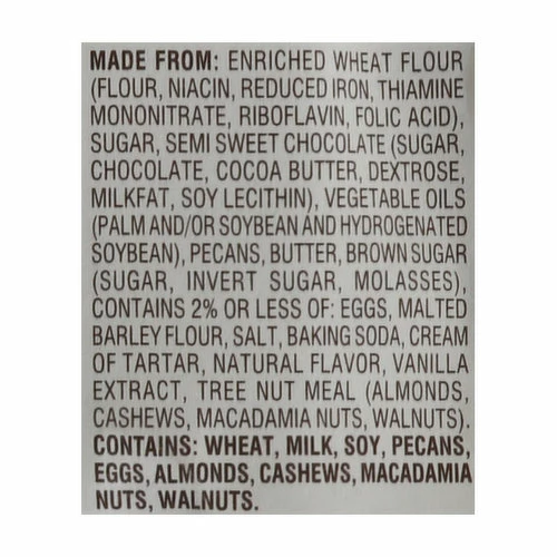 Made from: Enriched Wheat Flour (Flour, Niacin, Reduced Iron, Thiamine Mononitrate, Riboflavin, Folic Acid), Sugar, Semi Sweet Chocolate (Sugar, Chocolate, Cocoa Butter, Dextrose, Milkfat, Soy Lecithin), Vegetable Oils (Palm and/or Soybean and Hydrogenated Soybean), Pecans, Butter, Brown Sugar (Sugar, Invert Sugar, Molasses), Contains 2% or Less of: Eggs, Malted Barley Flour, Salt, Baking Soda, Cream of Tartar, Natural Flavor, Vanilla Extract, Tree Nut Meal (Almonds, Cashews, Macadamia Nuts, Walnuts).