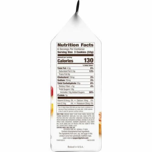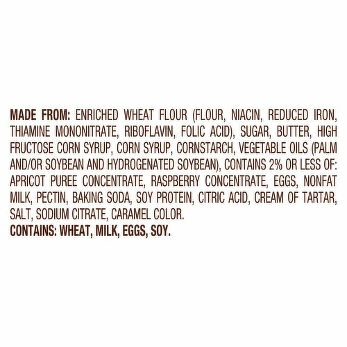 Made from: Enriched Wheat Flour (Flour, Niacin, Reduced Iron, Thiamine Mononitrate, Riboflavin, Folic Acid), Sugar, Butter, High Fructose Corn Syrup, Corn Syrup, Cornstarch, Vegetable Oils (Palm and/or Soybean and Hydrogenated Soybean), Contains 2% or Less of: Apricot Puree Concentrate, Raspberry Concentrate, Eggs, Nonfat Milk, Pectin, Baking Soda, Soy Protein, Citric Acid, Cream of Tartar, Salt, Sodium Citrate, Caramel Color.