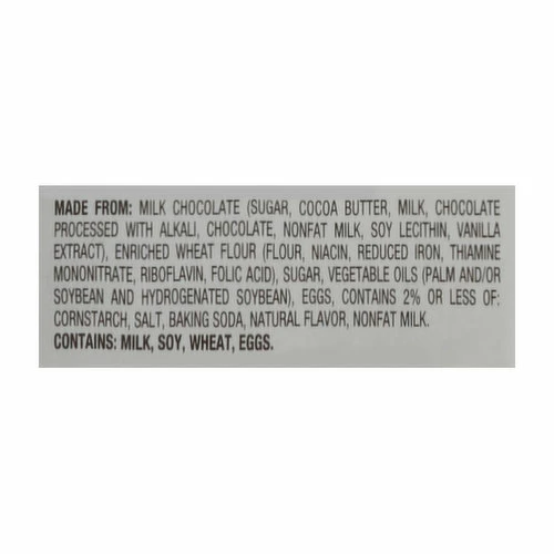 Made from: Milk Chocolate (Sugar, Cocoa Butter, Milk, Chocolate Processed with Alkali, Chocolate, Nonfat Milk, Soy Lecithin, Vanilla Extract), Enriched Wheat Flour (Flour, Niacin, Reduced Iron, Thiamine Mononitrate, Riboflavin, Folic Acid), Sugar, Vegetable Oils (Palm and/or Soybean and Hydrogenated Soybean), Eggs, Contains 2% or Less of: Cornstarch, Salt, Baking Soda, Natural Flavor, Nonfat Milk.