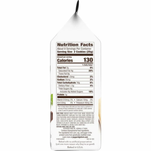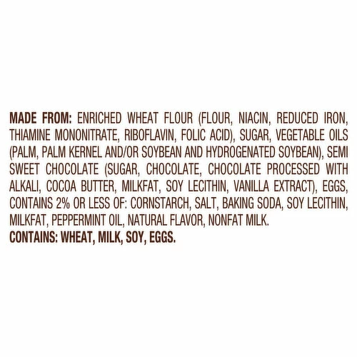 Made From: Enriched Wheat Flour (Flour, Niacin, Reduced Iron, Thiamine Mononitrate, Riboflavin, Folic Acid), Sugar, Vegetable Oils (Palm, Palm Kernel and/or Soybean And Hydrogenated Soybean), Semi Sweet Chocolate (Sugar, Chocolate, Chocolate Processed With Alkali, Cocoa Butter, Milkfat, Soy Lecithin, Vanilla Extract), Eggs, Contains 2% or Less of: Cornstarch, Salt, Baking Soda, Soy Lecithin, Milkfat, Peppermint Oil, Natural Flavor, Nonfat Milk.