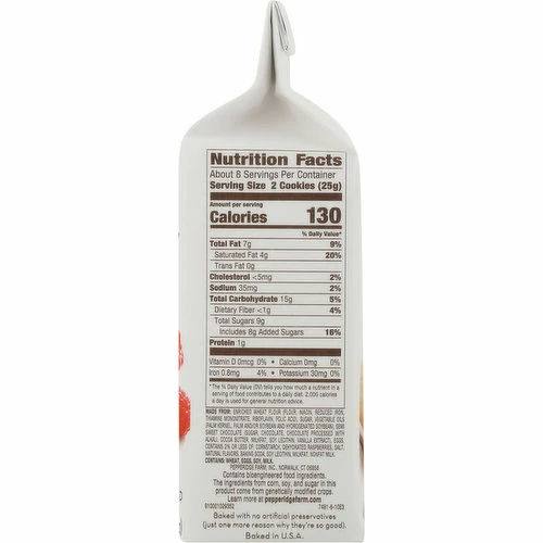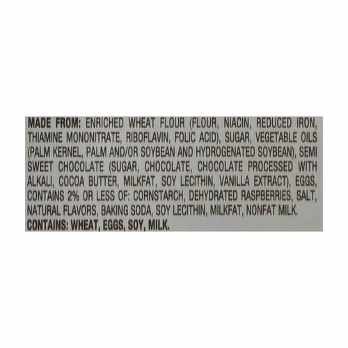 Made from: Enriched Wheat Flour (Flour, Niacin, Reduced Iron, Thiamine Mononitrate, Riboflavin, Folic Acid), Sugar, Vegetable Oils (Palm Kernel, Palm and/or Soybean and Hydrogenated Soybean), Semi Sweet Chocolate (Sugar, Chocolate, Chocolate Processed with Alkali, Cocoa Butter, Milkfat, Soy Lecithin, Vanilla Extract), Eggs, Contains 2% or Less of: Cornstarch, Dehydrated Raspberries, Salt, Natural Flavors, Baking Soda, Soy Lecithin, Milkfat, Nonfat Milk.