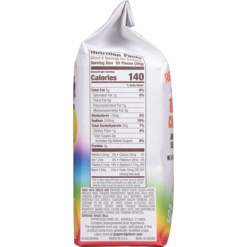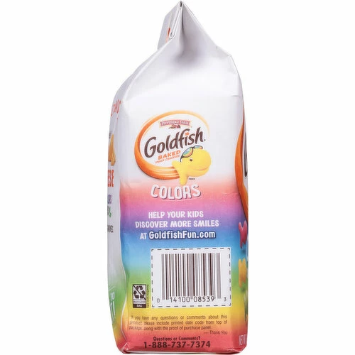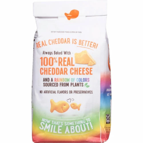No artificial flavors. Per 55 Pieces: 140 calories; 1 g sat fat (5% DV); 240 mg sodium (10% DV); 0 g total sugars. No artificial preservatives. The ingredients from soy, sugar, and canola in this product come from genetically modified crops. Learn more at pepperidgefarm.com. Colors sourced from plants. Real cheddar is better! Always baked with 100% real cheddar cheese and a rainbow of colors sourced from plants. No artificial flavors or preservatives. Now that’s something to smile about! pepperidgefarm.com. goldfishfun.com. If you have any questions or comments about this product, please include printed date code from top of package, along with the proof of purchase panel. Thank you. Questions or Comments? 1-888-737-7374. Help your kids discover more smiles at goldfishfun.com. Baked in U.S.A.