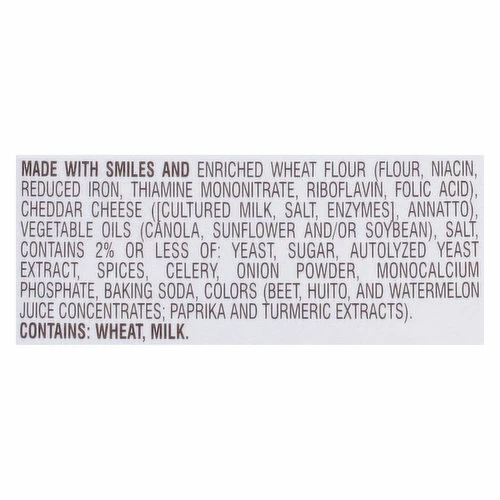 Made with Smiles and Enriched Wheat Flour (Flour, Niacin, Reduced Iron, Thiamine Mononitrate, Riboflavin, Folic Acid), Cheddar Cheese ([Cultured Milk, Salt, Enzymes], Annatto), Vegetable Oils (Canola, Sunflower and/or Soybean), Salt, Contains 2% or Less of: Yeast, Sugar, Autolyzed Yeast Extract, Spices, Celery, Onion Powder, Monocalcium Phosphate, Baking Soda, Colors (Beet, Huito, and Watermelon Juice Concentrates; Paprika and Turmeric Extracts).
