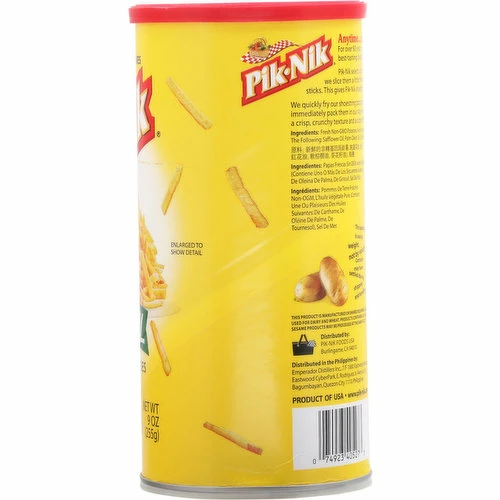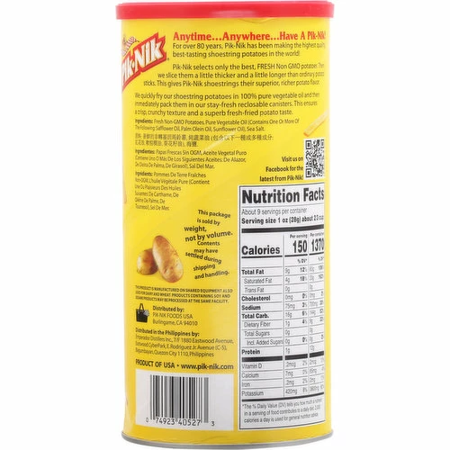 0 trans fat. Certified gluten-free. Non GMO Project verified. nongmoproject.org. Anytime – Anywhere- Have a Pik-Nik! For over 80 years, Pik-Nik has been making the highest quality, best-tasting potato snacks in the world! Pik-Nik select only the best, fresh Non GMO potatoes. Then we slice them a little thicker and a little longer than ordinary potato sticks. This gives Pik-Nik shoestrings their superior, richer potato flavor. We quickly fry our shoestring potatoes in 100% pure vegetable oil and then immediately pack them in our stay-fresh reclosable canisters. This ensures a crisp, crunchy texture and a superb fresh-fried potato taste. This package is sold by weight, not by volume. Contents may have settled during shipping and handling. 0 preservatives. www.pik-nik.com. Visit us on Facebook for the latest from Pik-Nik! Product of USA. Made in USA.