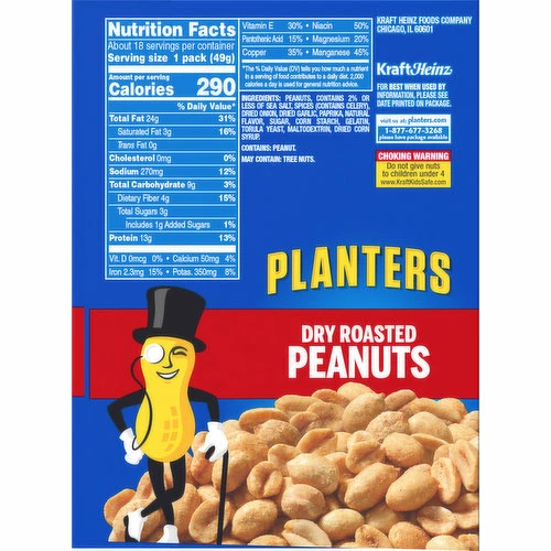 Per Pack: 290 calories; 3 g sat fat (16% DV); 270 mg sodium (12% DV); 3 g total sugars. planters.com. Visit us at: planters.com or call us at: 1-877-677-3268. Please have package available. Snack Smart On The Go with Planters Dry Roasted Peanuts – Pick up this 18-pack of snack-sized dry roasted peanuts to add to your family’s brown bag lunches. A conveniently-sized packet of tasty dry roasted peanuts will stave off hunger pangs for a family on the go. A nutritious 1 3/4 ounces of peanuts with sea salt will provide your family with the fuel they need to keep going, and the crunchy taste of nuts is always satisfying. Good on the Go or Mid-Day – For a snack or as the perfect finish to a brown bag lunch, this snack-sized packet of peanuts is a great choice. At home, you can also add them as an ice cream topping for desserts with extra nutty flavor.